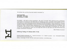 Axel T Schmidt war in diesem Zeitraum Dozent an der Petersburger Akademie, als Künstler der Wiener Galerie „Ausstellungs-Raum 10/20“ nahm er in diesem Zeitraum auch an der Biennale 92 der Stadt Petersburg teil. Sie kennen sicher einige seiner Arbeiten bereits: Panzerhase, Erd-Umfang, Tunnel/ Mühlberg, Weiden Schafft Leiden Schaft, Stiffenstuff, und jetzt Left Info.