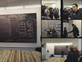 Der große Foto-Druck auf Leinwand gegenüber dem Bauzaun gibt weiterführende Impulse. Er zeigt im Farbton verblichener Fotografien ein Arsenal propagandistischer Gebrauchsgüter. Sowjetische Plakate und Spruchbänder und die Stempel, die West-Künstler Schmidt 1992 für seine künstlerische Arbeit verwendete, verbinden sich hier zu nahtloser Einheit. Was bei näherer Betrachtung erkennbar wird, ist: die rätselhafte Schablonendruck-Form, die immer wieder vor allem im Ausstellungsraum auf den Fotografien des heutigen Petersburg auftaucht, ist Lenins Linkes Auge. Aus dem Zusammenhang gerissen erscheint seine schwarze Form so bedeutungsvoll wie konstruktivistischer Kaffeesatz.