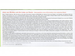 In der Talentpflege von damals bis heute hat der Kunstverein Weiden im Rahmen seiner eher beschei-denen Mittel bereits mehrfach wichtige Projekte ange-schoben. Herlts Arbeit setzt nun Maßstäbe, sein aus-geprägtes Traditionsbewusstsein und sein künstleri-sches Ethos als Vermittler haben (1) die exempla- rische Größe, die öffentliche Resonanz einfordert, auch wenn Herlt selber ein Mensch ist, der die öffent-liche Bühne lieber meidet. Aus dieser schwierigen vom Kalten Krieg und der deutschen Vergangenheits-Be-wältigung geprägten Zeit, kennt man vielleicht nur noch die Distel von Herbert Mollwitz (1901 – 1970), welche die Optik vieler öffentlicher und privater Räume regierte. Eine Zusammenschau des damaligen, von hiesigen Künstler/innen getragenen Kunstraumes existiert nur ansatzweise.