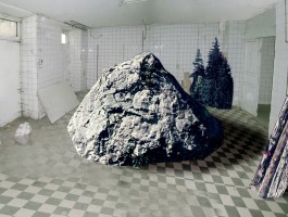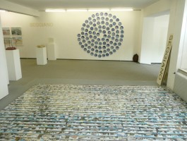 Dem gegenüber die riesige, auf dem Boden liegende Foto-Arbeit „Inventur“. Es ist die Akkumulation aller Gebäude Waldsassens, sie zeigen sich im Kleinformat wie Immobilien im Makler-Schaufenster, die realen Wohnstätten mehrerer tausend Waldsassener treten uns als Masse- und Energie-Moment und als Standort-Zeichen des individuellen Arrangements in der kollektiven Begrenztheit entgegen.